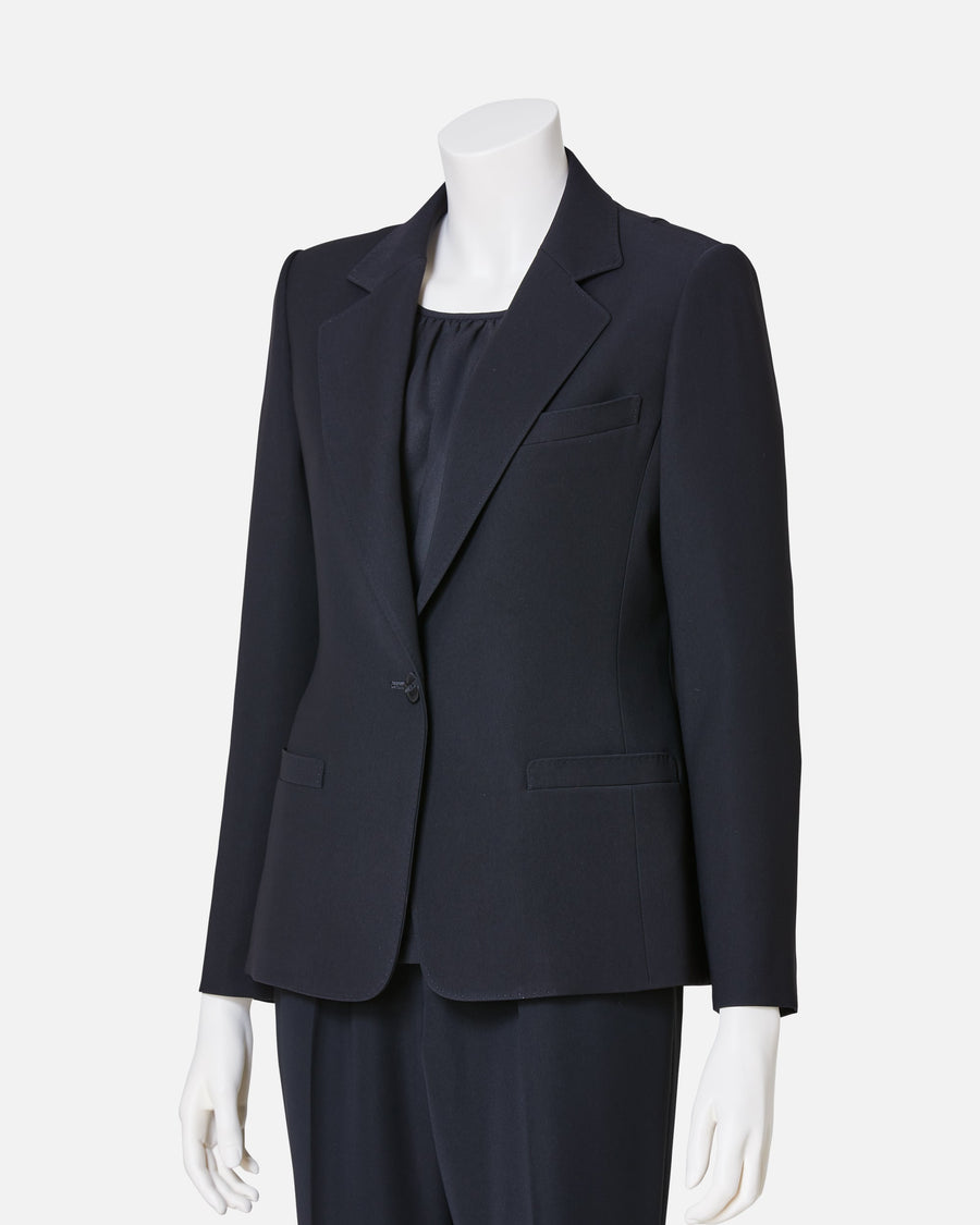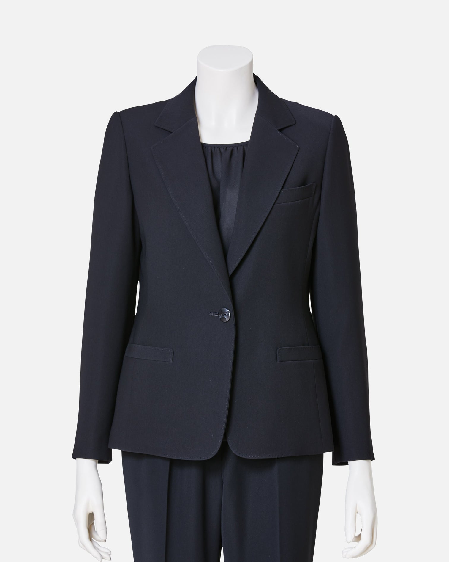 一つボタンで程よくシェイプされており、ボディラインを美しく見せる効果が加えて、流行に左右されないデザインのスーツです。