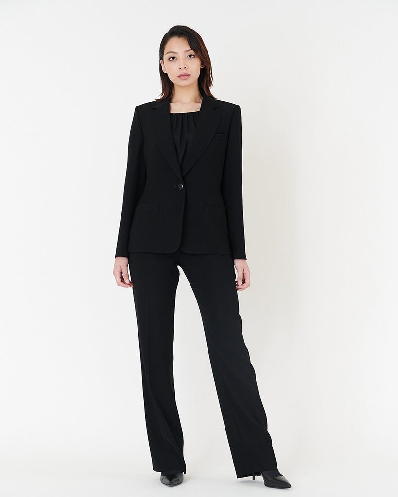 一つボタンで程よくシェイプされており、ボディラインを美しく見せる効果が加えて、流行に左右されないデザインのスーツです。